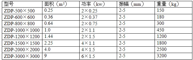 注:此表為上、下振形式振動(dòng)平臺(tái)技術(shù)參數(shù),僅供參考;此外可以根據(jù)用戶實(shí)際使用需要定做臺(tái)面大小來選用振動(dòng)電機(jī)數(shù)量及功率。